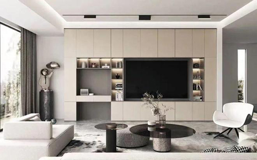 電視墻全鋁書柜:客廳定制了一整面墻的全鋁收納柜,將全鋁電視柜和全鋁書柜組合設計,既個性又實用,一舉兩得。
