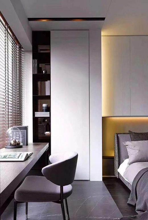 床頭全鋁書桌柜:針對床頭擺放書桌的情況,直接采取書桌柜一體式的設計就好了。