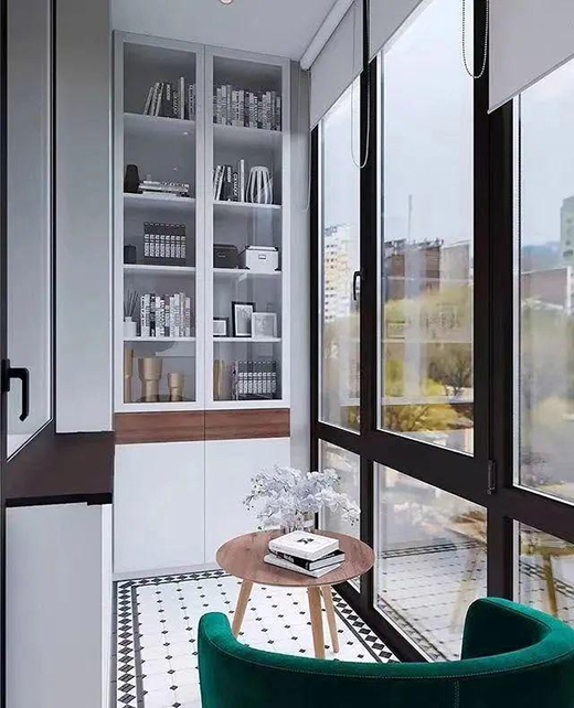 陽臺全鋁書柜:把陽臺封起來,這里也可以定制一個小全鋁書柜,擺上一個小茶幾和單人沙發,平時就坐在這里看看書,感受歲月靜好。