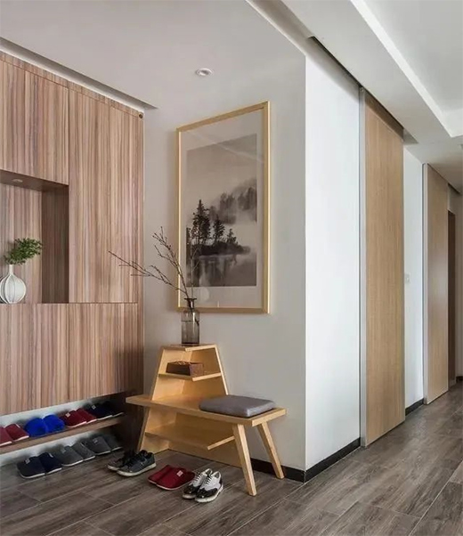 現(xiàn)在流行在一整面墻上把鞋柜和衣柜都做在一起,出入的外套和帽子都可以直接掛在上面,不用設(shè)置轉(zhuǎn)軸門,坐在換鞋凳上換完鞋,起身就能拿取,特別方便。