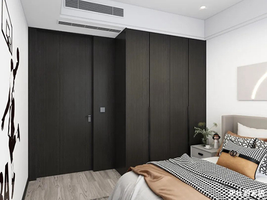 臥室里利用了深色調的木色搭配中性灰色,讓衣柜顯得更加高級,整個和床頭背景層次錯落,顏色大膽跳躍。