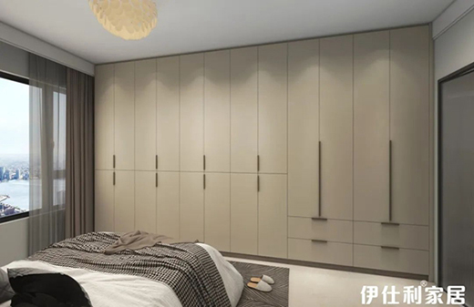 在床尾設計了整墻的大衣柜,滿足了居住者超大儲物空間的需求,衣柜收納分區多樣化,讓拿取更方便,柔軟的色彩營造出輕松、愜意氛圍。