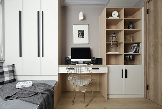 書房區域,在并不寬敞的空間內,通過定制的全鋁家具滿足功能及儲物需求,將榻榻米、衣柜和書桌及書柜做了一體化結合設計,即便是素色空間,卻能讓人感受到溫暖而舒適的愜意生活。