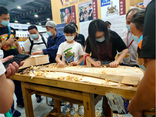 此外,廣州格利蒙那提琴有限公司不僅帶來交響樂園團隊表演,也現場進行倍大提琴音板制作、大提琴圓邊、小提琴安裝琴柄制作演示,為觀眾們揭秘了一把好琴的制作過程。