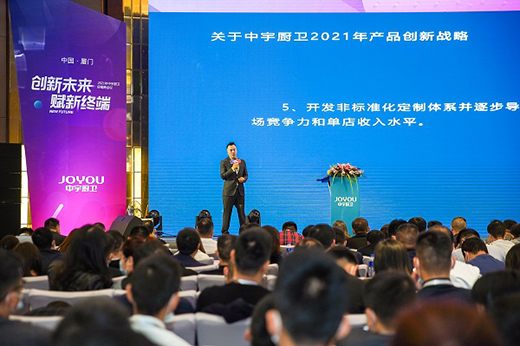 產品煥新模塊,陳華榮副總經理解析了2021年中宇新品的創新所在,更新型的材料和更先進的工藝以及更具設計感和時尚范的潮流外觀。未來,中宇廚衛將實現運用JOYOU智能物聯技術打造“JOYHOME”智能產品生態鏈的遠景戰略。