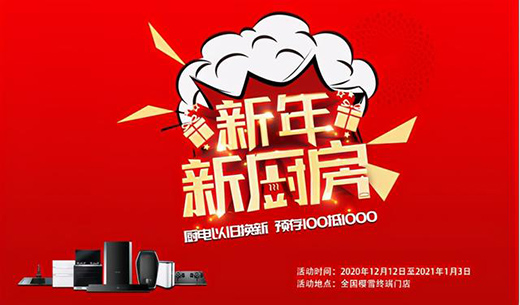 據悉,櫻雪已啟動“新年新廚房”年終廚電狂歡節,推出“廚電以舊換新,預存100抵1000”活動。與此同時,結合健康家電消費潮流,優惠折上折,大力度回饋消費者。