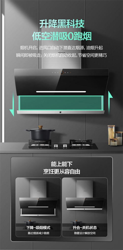 油煙機的基本功能是吸煙與排煙,萬和根據(jù)油煙不上臉特性開發(fā)了萬和智能升降油煙機,萬和L26T煙機,將吸煙口大幅下探的方式來讓吸煙口離油煙源更近,使吸煙口離灶臺僅有30cm,只有油煙剛產(chǎn)生,瞬間吸走,即使猛火爆炒也不跑煙。同時,該煙機搭配23m3/min的大風(fēng)量與430Pa大風(fēng)壓雙重強大的性能加持,即使是做飯高峰期也能快速將油煙排出去。
