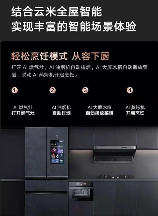 想象一下,你回到家,想準(zhǔn)備一桌豐盛的晚宴,走進(jìn)廚房,語音操控AI大屏冰箱播放想要看的菜譜,打開AI燃?xì)庠睿珹I油煙機(jī)自動實(shí)現(xiàn)排煙,同時(shí)聯(lián)動AI蒸烤機(jī)開啟烹飪模式……一直以全屋互聯(lián)網(wǎng)智能家居開創(chuàng)者自居的云米,為消費(fèi)者勾勒出了這樣一副智能廚房生活場景。