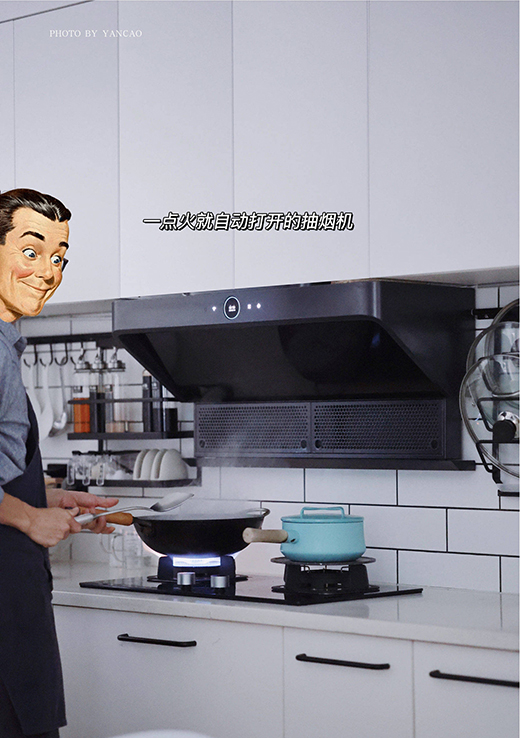 一點火就自動打開的油煙機,可以和燃氣灶聯動。開火的同時,油煙機自動升降打開,側吸+頂吸一起工作,無論調節風力還是開關機,直接解放雙手。
