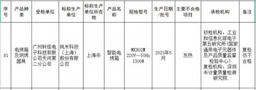 2022年2月8日,純米科技(上海)股份有限公司收到了上海市崇明區市場監督管理局的行政處罰,沒收416元,罰款6375元。處罰原因為:純米科技生產的智能電烤箱,型號為“MKX02M220V~50Hz 1300W”的產品,發熱項目不符合GB4706.1-2005、GB4706.14-2008標準,此后純米科技還曾申請復檢,但二次檢測后依然不合格。