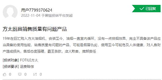 近日在黑貓投訴平臺上有用戶稱,3 年前在線下購入的方太油煙機一直存在質量問題,至今都沒有得到很好的解決方案。