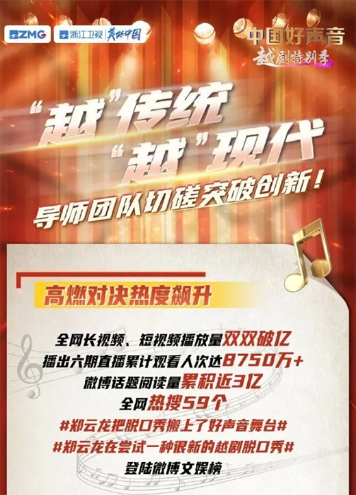 中國文藝評論家協(xié)會傅謹(jǐn)文藝點(diǎn)贊道:《中國好聲音》是電視節(jié)目中的頂流,越劇是戲曲中最有觀眾緣的劇種之一,兩相疊加,取得了超出預(yù)想的效果,短短幾期節(jié)目長視頻和短視頻播放量就雙雙過億。 節(jié)目切實(shí)挖掘并充分展現(xiàn)戲曲本身的意義與價(jià)值,顯現(xiàn)戲曲的美感,綻放戲曲的魅力!