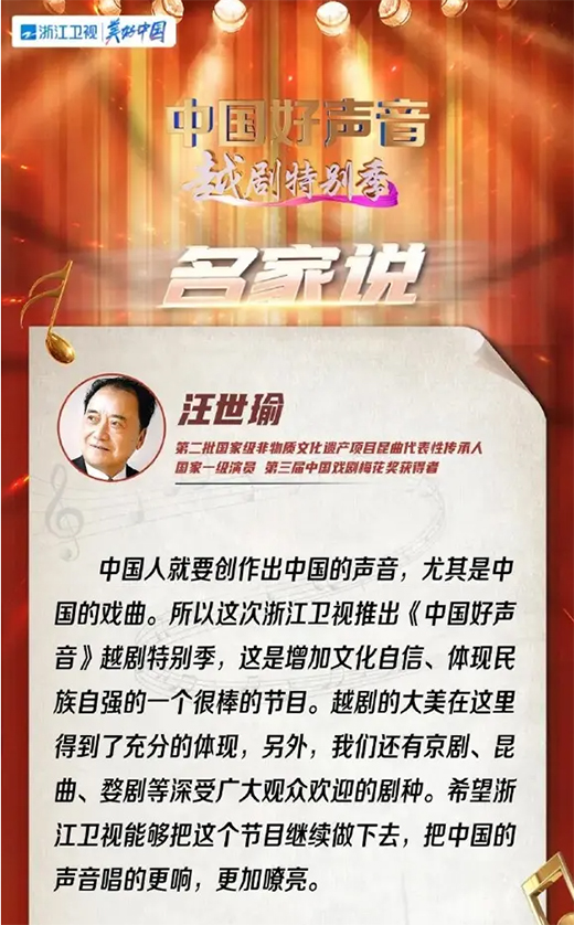 第二批國家級非物質(zhì)文化遺產(chǎn)項(xiàng)目昆曲代表性傳承人、國家一級演員、第三屆中國戲劇梅花獎獲得者汪世瑜贊道:越劇的大美在《中國好聲音》越劇特別季得到了充分的體現(xiàn),希望中國的聲音唱得更響,更加嘹亮!