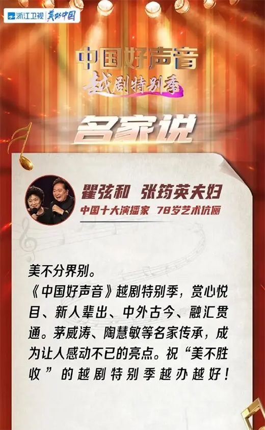 中國十大演播家、78歲藝術(shù)伉儷瞿弦和、張?bào)抻⒎驄D發(fā)聲:美不分界別。越劇特別季,賞心悅目、新人輩出、中外古今、融會貫通。《中國好聲音》越劇特別季的熱播也讓更多觀眾欣賞到了越劇的魅力,為弘揚(yáng)傳統(tǒng)文化立起標(biāo)桿!