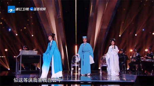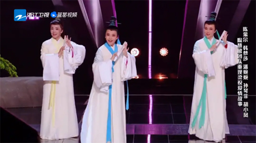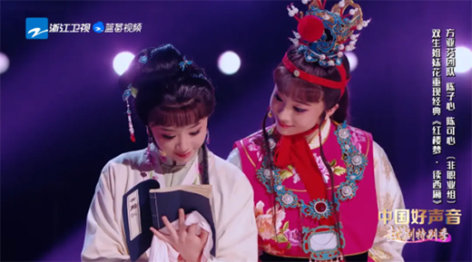 本期越劇舞臺的精彩節(jié)目從創(chuàng)新+傳承的角度,展現(xiàn)了越劇的無限活力。《梁山伯與祝英臺·回十八》,演繹三重不同個(gè)性的梁山伯,不同的服裝設(shè)計(jì)同樣的仙氣飄飄,讓人大開眼界;節(jié)目中更是出現(xiàn)了以時(shí)下流行的“脫口秀”為載體,融合潮流音樂、說唱等元素的“越劇脫口秀”,成為全場最大的亮點(diǎn);來自越劇之鄉(xiāng)——嵊州的雙胞胎姐妹陳子心、陳可心,演繹無數(shù)越劇迷耳熟能詳?shù)摹都t樓夢》經(jīng)典片段,俊美的扮相讓茅威濤和鄭云龍夸贊“仿佛從畫中走出來”。
