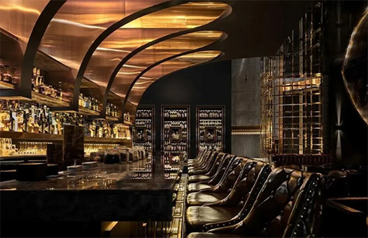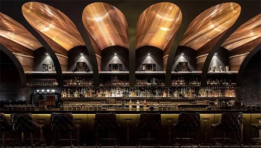 酒吧頂部延伸的設計來源于威士忌的原料大麥,大麥屹立生長,達到一定高度時向下彎曲,卻依舊不倒,寓意人們生活就算再艱難也要對未來充滿幻想,而金屬的設計恰好為這“生活”添加色彩。