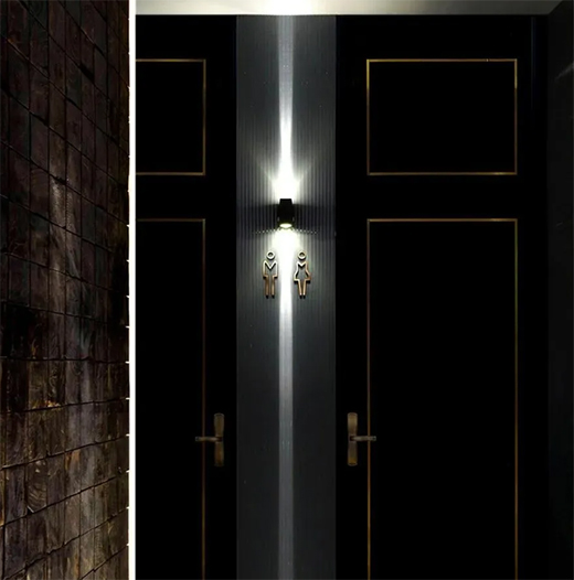 衛生間門上的金屬線條經過光的反射,給昏暗的空間增添亮度,防止發生碰撞。