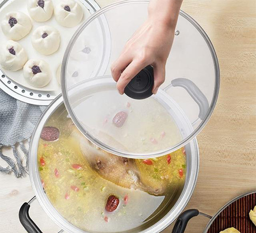 下面的鍋體采用了直角鍋身的設(shè)計,時尚的造型又增添了新的功能,鍋壁質(zhì)感厚重,可以用來煮火鍋,家庭聚會就用這個鍋來吃火鍋真的特別的方便,而且304不銹鋼的材質(zhì),抗腐蝕,清洗起來也特別的容易。對于廚房空間不大的家庭,這款蒸鍋可疊放的設(shè)計也更加節(jié)省的收納空間,各個方面的設(shè)計真的太棒了。