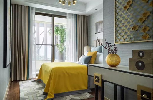 客臥色調(diào)偏清爽,加上絕佳的采光和陽臺(tái),令人心曠神怡。在這個(gè)空間中,東方元素?zé)o處不在。