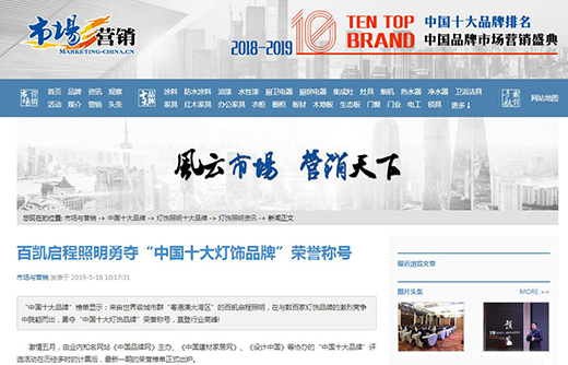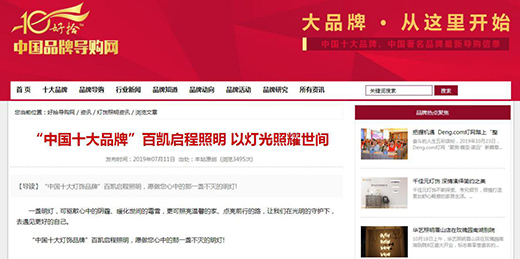2019年,從《新浪》、《網易》、《搜狐》、《騰訊》等中國著名門戶網站,到《中國品牌網》、《中國品牌招商網》、《中國品牌導購網》等全行業知名媒體,再到《中國建材家居網》、《中國家居資訊網》等泛家居行業平臺,都曾對百凱啟程照明進行過采訪與報道,也皆對百凱啟程的發展給予了高度的評價。