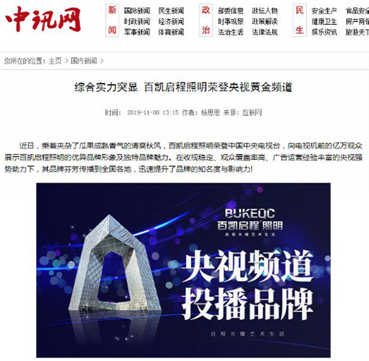 《中訊網》報道:中國中央電視臺是我國的新聞輿論機構和思想文化陣地,具有傳播范圍廣、觀眾覆蓋率高、收視率高等其它衛視平臺無可比擬的優越性。近期,百凱啟程照明榮登中國中央電視臺,向電視機前的億萬觀眾展示百凱啟程照明的優異品牌形象及獨特品牌魅力。