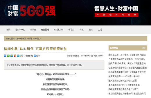 又如2019年中秋節,百凱啟程在《中國財富500強》上刊載對粉絲“愛的告白”:月光雖無法十二時辰照亮我們,但百凱啟程照明卻可時時刻刻守候在旁。不管白天,還是黑夜,只要你需要,百凱啟程便一直在!