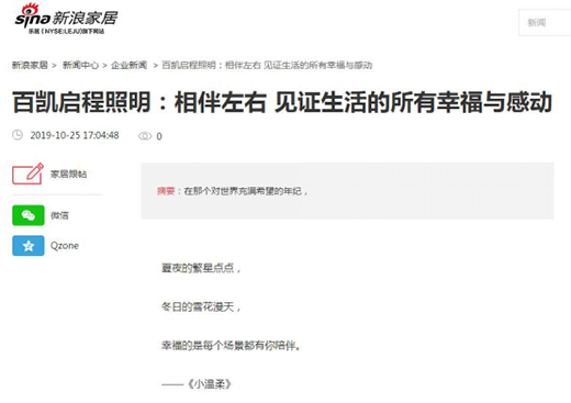《新浪家居》講述某位消費者的故事:幸福的每個場景,都與百凱啟程照明有關。