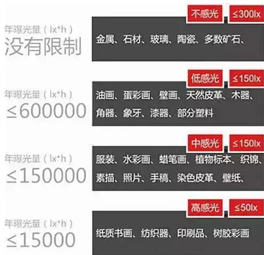 為了展品的安全,應(yīng)當(dāng)注意光輻射對展品的損害,對燈具的紫外線和紅外線使用濾鏡進(jìn)行過濾,對于展品的照度水平也要嚴(yán)格控制,同時對展品燈光的年曝光量進(jìn)行控制。假定展品的照度水平為200lx,博物館每周照明60h,那么對于展品來說,一年的總的曝光量為600000lx*h。
