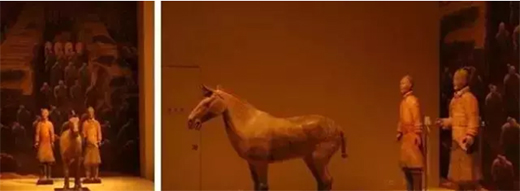 秦始皇陵的兵馬俑每一件都是藝術(shù)珍品,但是,看到兵馬俑整齊的陣列時,絕不是單個感受簡單意義上的疊加,而是在于無限重復(fù)帶來的震撼與沖擊。國博中有一個場景是秦兵馬俑,二維半的形式。這樣的形式優(yōu)點在于小空間反映大場面,關(guān)鍵是要把前置的場景精細(xì)的表達(dá),背景虛化則鋪陳出宏大的場面,并將前景獲得的精確信息推想到無限的場景中去,可謂以點帶面的典型手段。