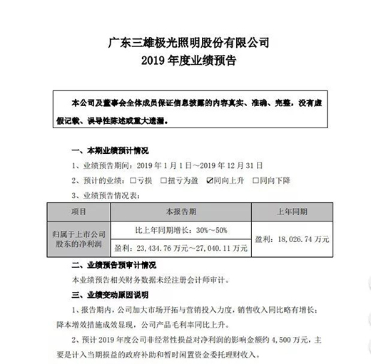 《公告》內(nèi)容顯示,三雄極光2019年1月1日—2019年12月31日,歸屬于上市公司股東的凈利潤比上年同期增長30%—50%,盈利為23434.76萬元-27040.11萬元,上年同期盈利為18026.74萬元。