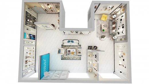 門店整體使用展廳式的陳列方式,產品與裝飾搭配,可以給消費者更加直觀的體驗,通過門店的產品分類展示,能更容易讓消費者進店尋求所需,一目了然。搭配休息區、洽談區,更體現專業店的人性化和互動性。