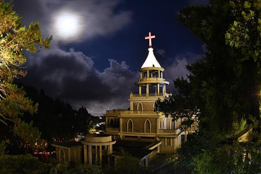 鼓嶺教堂夜間少有游客游覽,坡道兩側布設了連貫的照明燈帶,方便游客夜間散步。鼓嶺教堂的圓錐形屋頂,在燈光的映照下,熠熠生輝。