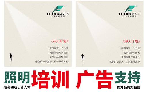 在當前電商野蠻沖擊傳統渠道商業模式的大環境下,鋒磁天下以國家認證的高品質產品和本地化優質安裝服務,避開普通低價電商產品和質量不可控的第三方服務的惡性競爭!以鋒磁天下的品牌影響力,避開國內一線品牌的惡性價格戰!照明是家庭剛需,無主燈照明更是潮流趨勢,市場容量大,差異化需求旺盛,這樣的優質品牌和品類創富機會已很少,機會難得!我們需要有高端產品運營渠道和資源(包括建材市場、設計師與裝修公司)的合伙人,能獨立運營區域市場的客戶共創共贏!