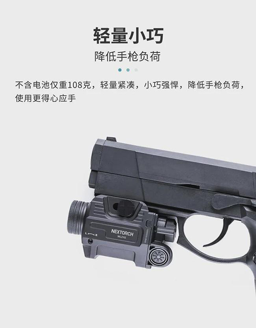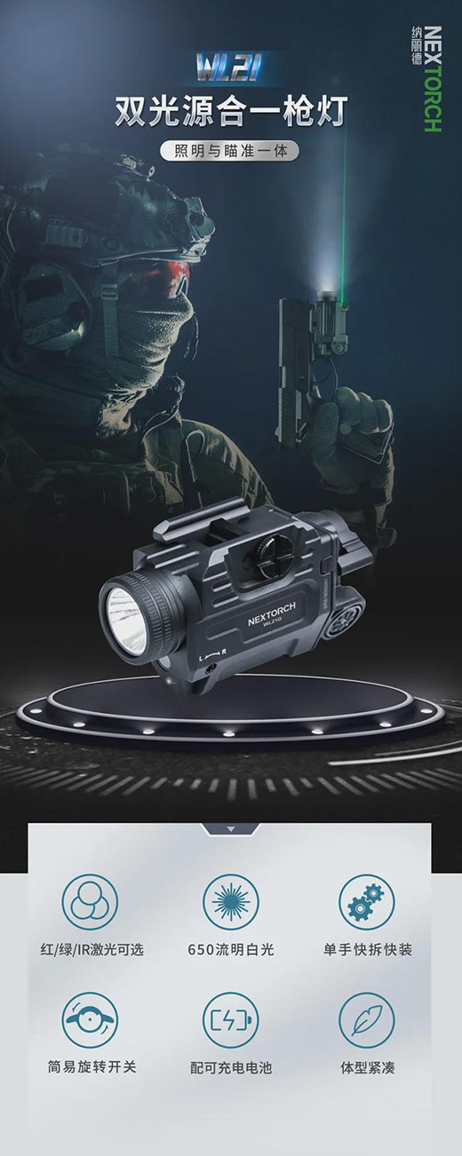 納麗德WL21雙光源合一槍燈,整合照明識別和激光瞄準(zhǔn)功能,更能夠輔助射擊或震懾潛在的攻擊威脅。