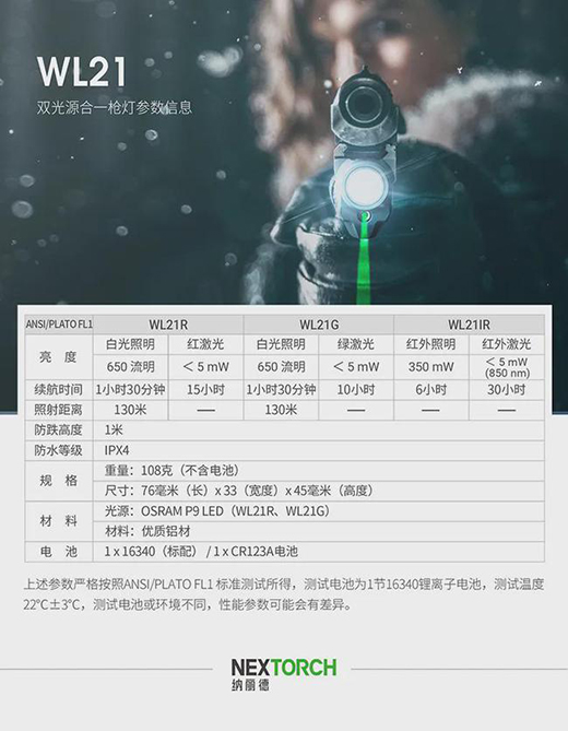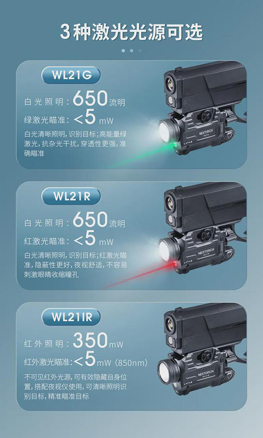提供WL21G白光照明+綠激光瞄準(zhǔn)、WL21R白光照明+紅激光瞄準(zhǔn)、WL21IR紅外照明+紅外瞄準(zhǔn)共3種激光光源,可根據(jù)不同任務(wù)需求適當(dāng)搭配,成為暗弱光執(zhí)法下的有效助力。