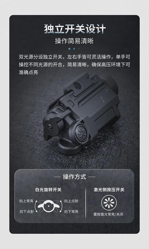 WL21R,白光照明+紅激光瞄準(zhǔn),白光識別目標(biāo);紅激光瞄準(zhǔn),隱蔽性更好,夜視舒適,不容易刺激眼睛收縮瞳孔;
