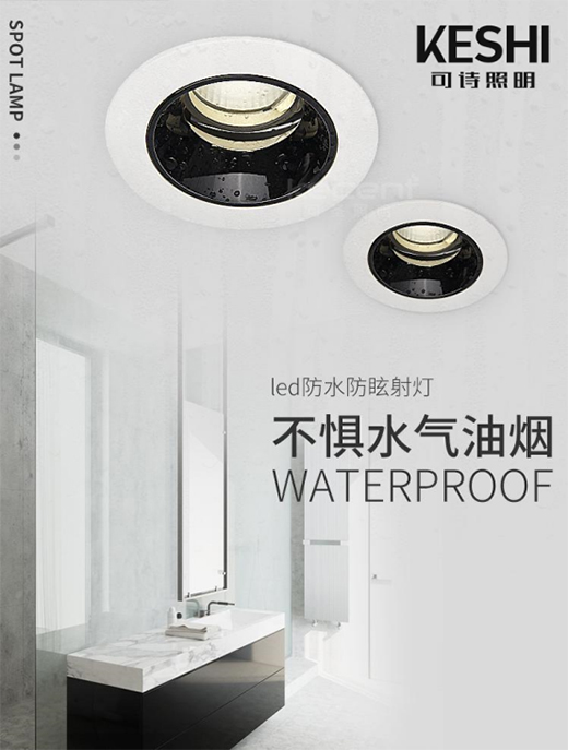 像KESHI可詩照明熱銷的LED防水防眩射燈,不懼直接潑水,防水能力強(qiáng);且光源深藏、光線柔和;將其安裝在淋浴區(qū)上方,即便我們較長時間躺在浴缸里,也不用擔(dān)心燈光刺眼而影響到泡澡的好心情了。同時,燈具的安全性也大有保障。