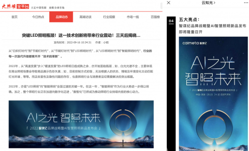 基于金流明公司深厚的技術積累,智謀紀此次預告“AI+LED”的技術創新,也引起了照明行業的熱議。這不僅代表智謀紀攻克了照明技術創新瓶頸,更表示其在“AI智慧照明”新賽道完成了關鍵技術布局。這一重要科技創新成果,也獲得了照明行業媒體的廣泛關注,大照明全平臺、云知光網、照明周刊“智慧Design”等媒體紛紛進行了報道。