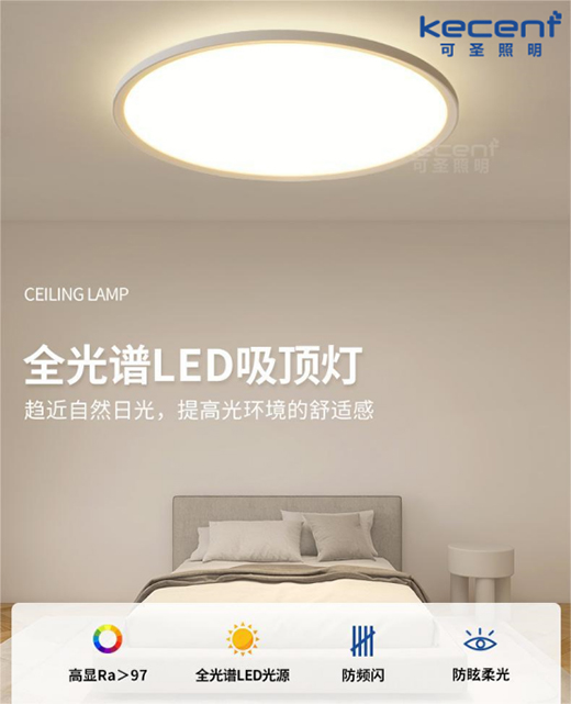 KECENT可圣照明全光譜LED吸頂燈配備全光譜芯片,能提供優質的光色與光感體驗,顯色指數Ra>97,R9>98,光色品質CQS≥98,可打造出讓用戶覺得更健康舒適的光環境。