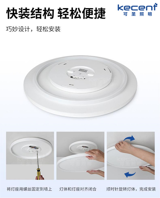 這款燈具擁有快裝結構,其安裝過程十分簡單,首先將燈座用螺絲固定到天花上,然后燈體和燈座對齊閉合,再順時針旋轉燈體,牢牢卡住即可。安裝較為輕松便捷,如果大家在安裝時還遇到其他疑問,也可以直接聯系KECENT可圣照明的客服獲取解決方法。