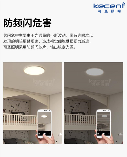KECENT可圣照明全光譜LED吸頂燈360°內側環繞發光,防眩指數UGR<19(UGR小于19,是人眼可以接受的眩光程度)。且燈具采用光學反射結構,經納米鍍膜反光紙、光學PMMA導光板、光學擴散板3層柔光處理,形成漫反射柔光環境,達到光線柔和不刺眼的效果。