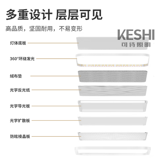 如我們所見,這款產品由多層結構組合而成,包含燈體底板、絨布墊、光學反光紙、光學導光板、光學擴散板及防眩棱晶板,層層組合,堅固耐用,不易變形。再加上360°環繞發光設計,無暗區更明亮,出光柔和均勻,照明面積更大,在防眩效果上也更有保證。