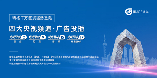 繼斬獲“中國(guó)十大品牌”稱號(hào)后,精格全新品牌廣告正式在央視頻道上線,全線覆蓋中國(guó)老百姓。本次大手筆進(jìn)行央視廣告投放,標(biāo)志著精格管道直飲水將邁進(jìn)更高端的市場(chǎng)定位,以央視平臺(tái)為載體,把精格高端的品牌形象深植于客戶心扉,伴隨著視頻的播放傳播到全國(guó)乃至世界各地。