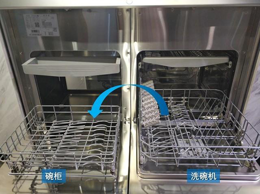 在機器的左下部分則是碗柜模塊,和洗碗機模塊連在一起。當餐具清洗完畢后,只需微微側身,就能實現餐具的取放,再也不用在廚房里來回搬運餐具,非常方便。