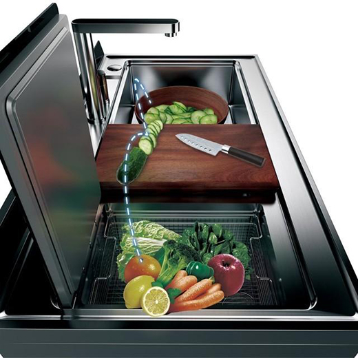 整體的臺面采用復式階梯槽體設計,可以放置瀝水簾和切菜板,擴充廚房臺面的同時,在清洗完食材后即可進行瀝干、切配處理;最右側還有大空間水槽,能夠滿足用戶的諸多需求。清洗、切配一站式操作,再也不用手忙腳亂。