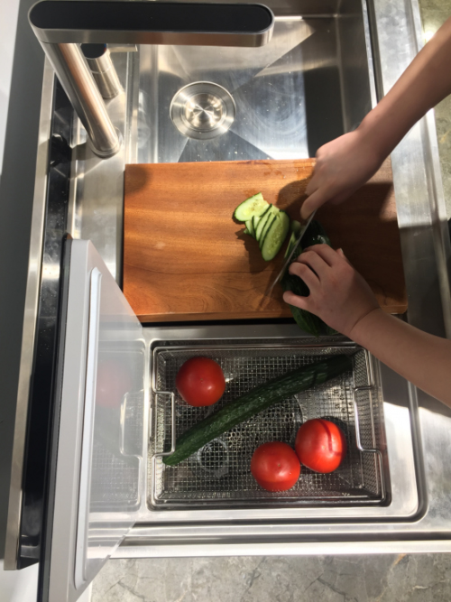 火星人D7集成洗碗機將眾多廚房物件通過一臺機器進行集成,通過水槽上的復式“小臺階”擴大空間利用率,在做飯時,站在原地不動就能夠?qū)⑾床恕r水、切菜、裝盤等步驟一氣呵成的完成。