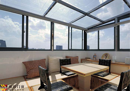 組成:維盾陽光房由鋼結構、陽光頂、斷橋鋁鋁包木門窗、智能通風系統等組成