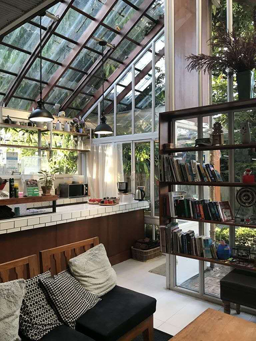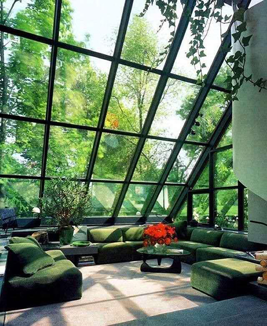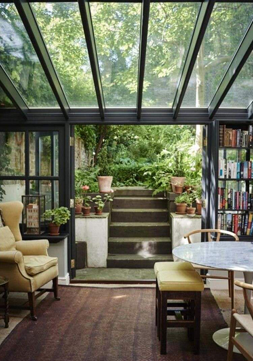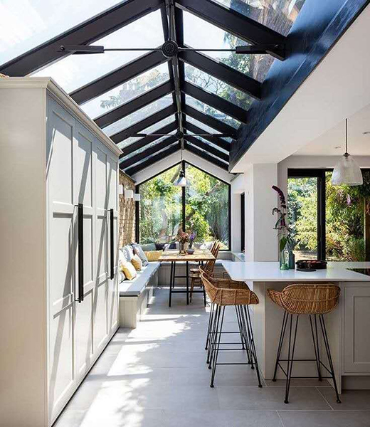 還可將陽光房裝扮成客廳、廚房等,陽光透過庭院中的樹叢,將樹影倒映在室內,給人一種光影斑駁的朦朧質感。就算與自然相隔一面墻或者是一面玻璃板,都不妨礙將自己置身于大自然中。