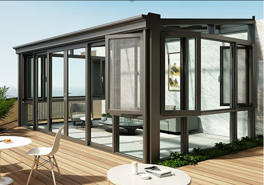陽光房垂直面的處理,通常是采用各種形式的窗或門加以封裝,在陽光房的維護結(jié)構(gòu)的設(shè)計中,應(yīng)著重考慮的是陽光房的功能,比如觀景陽光房可在陽光房維護結(jié)構(gòu)中使用無框窗,視線更為通透、無遮擋,而暖房式陽光房則更考慮其保溫、隔熱、節(jié)能、環(huán)保,可采用斷橋鋁門窗。