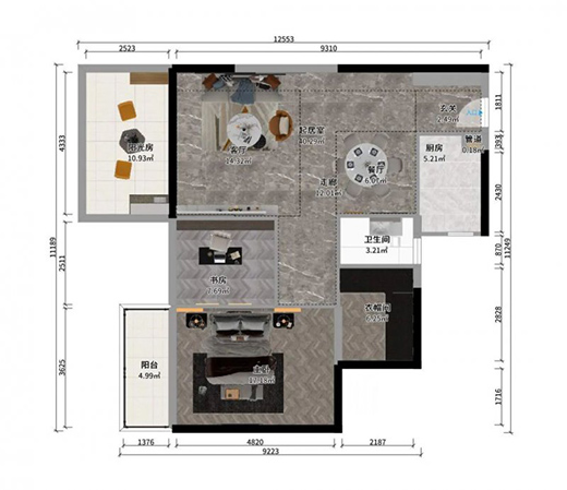 在現代簡約的基礎上凸顯高端品味的生活,室內布局用灰色和黃色進行延展,緊跟2021年家裝流行趨勢,營造高級有檔次又充滿溫暖氣息的居家氛圍。